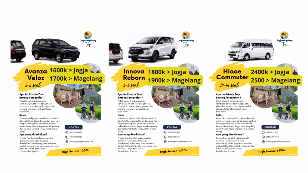 Private Trip Jogja Magelang by Jogjamagelangtrip menghadirkan pengalaman liburan eksklusif dengan rute fleksibel dan layanan pendampingan profesional. Setiap perjalanan dirancang personal, mencakup spot wisata populer, hidden gem, hingga dokumentasi foto premium. Dengan kenyamanan armada dan fotografer berpengalaman, perjalanan terasa lebih nyaman, aman, dan penuh momen berkesan.